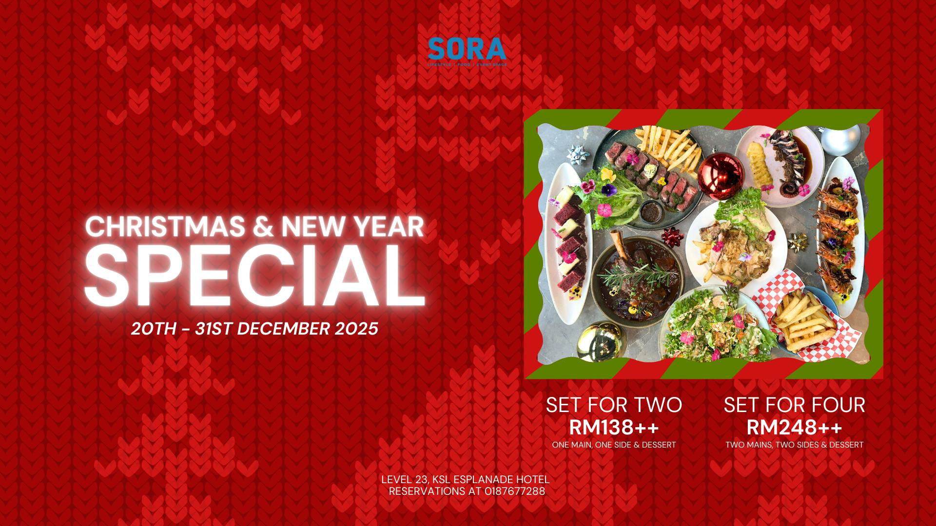 Christmas & New Year Special查看所有促销活动Celebrate the season with our Christmas Set feast featuring festive flavours and a touch of holiday magic. Join us for a warm, memorable celebration where every dish captures the spirit of Christmas.促销 查看所有 Wedding PackageCorporate Meeting PackageSora @ SkyStay And Dine PackageNo Stress, Just RestSORA FOR 2 & 4Exclusive Deal For Return GuestsAlpaca B-day Bash StayLover's HideoutAfternoon Tea at SORARoom with OnsenSunset CelebrationFamily Splash OutThrowdown CountdownLate RiserVacay AwaySantapan Warisan Buka Puasa 2026Christmas & New Year Special